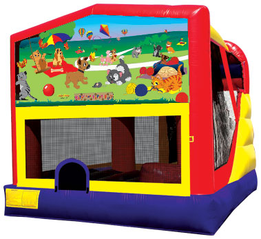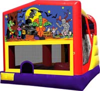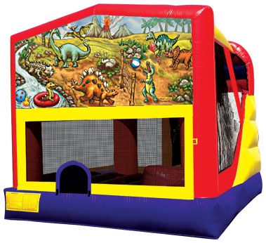 These units have it all! This amazing unit combines four activities into one jumper: LARGE jumping area, basketball hoop, climber, and a nine-foot slide.