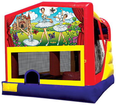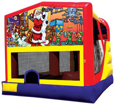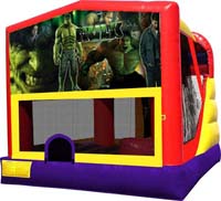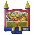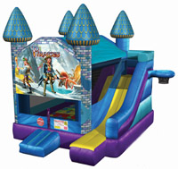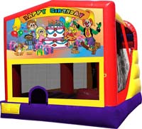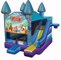 3D combination bouncers featuring his and hers favorite characters. Vivid wrap-around color imaging and an exclusive 4 in 1 design with a slide, soft ladder, large jump area, and a soft basketball rim all in one jumper.
